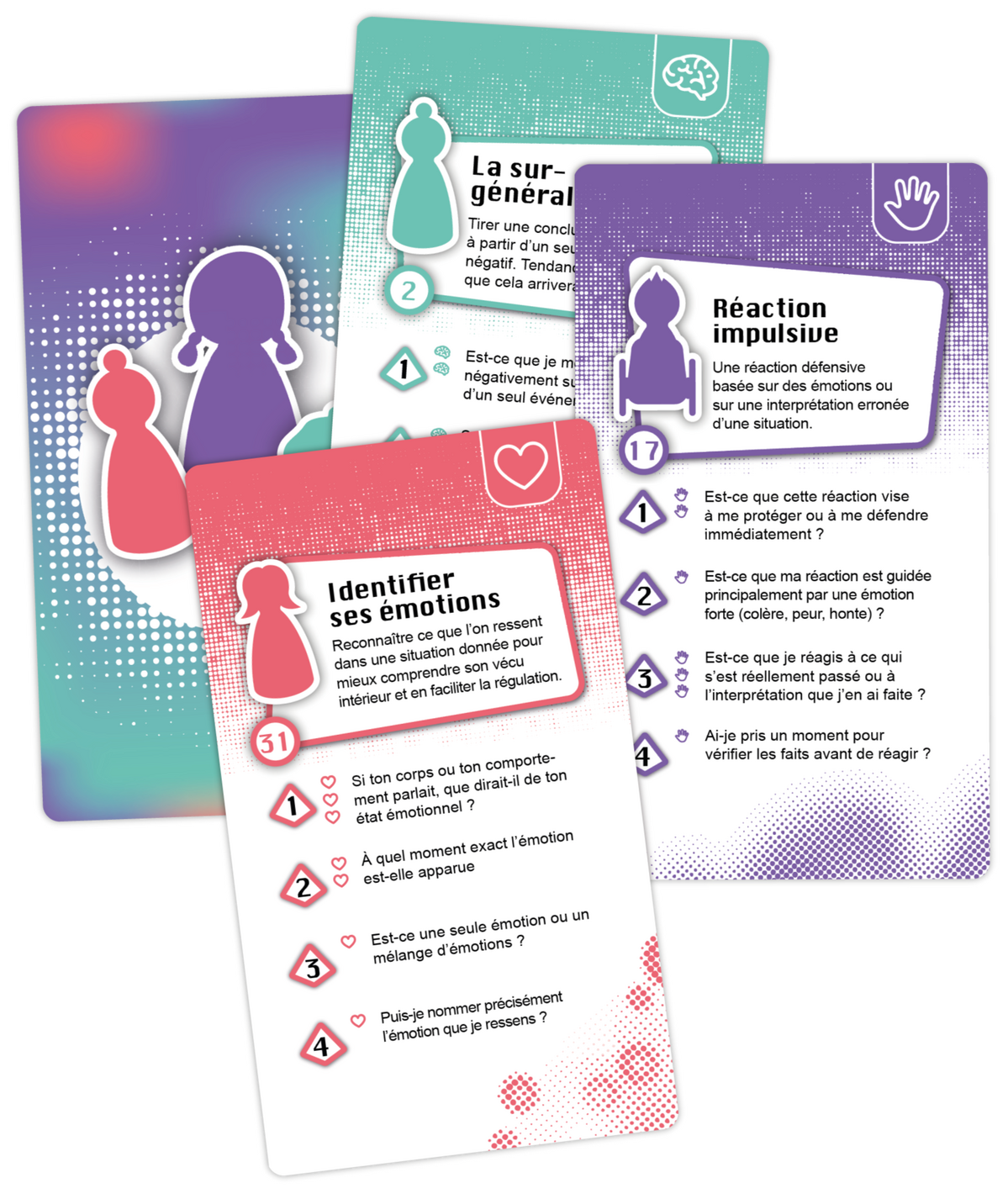 Explor'Je est un jeu de cartes basé sur les principes de la thérapie cognitive comportementale (TCC), ce jeu permet d’explorer les liens entre les pensées, émotions et comportements de manière concrète, visuelle et engageante.
