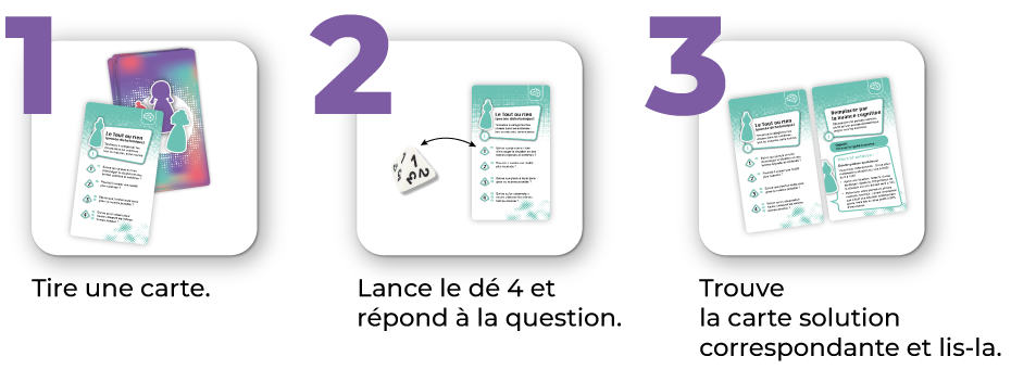 Le thérapeute propose à Marie d’explorer ses pensées à l’aide des cartes.Dans un premier temps, Marie est invitée à parcourir les cartes pensées et à sélectionner toutes celles dans lesquelles elle se reconnaît. Elle en choisit plusieurs, ce qui lui permet déjà de réaliser que certaines pensées reviennent fréquemment dans son quotidien.Ensuite, elle choisit une première carte à explorer avec sa thérapeute.Marie lance le dé, qui l’amène à une question spécifique liée à la carte sélectionnée. Elle prend un moment pour réfléchir et y répondre, guidée par sa thérapeute.