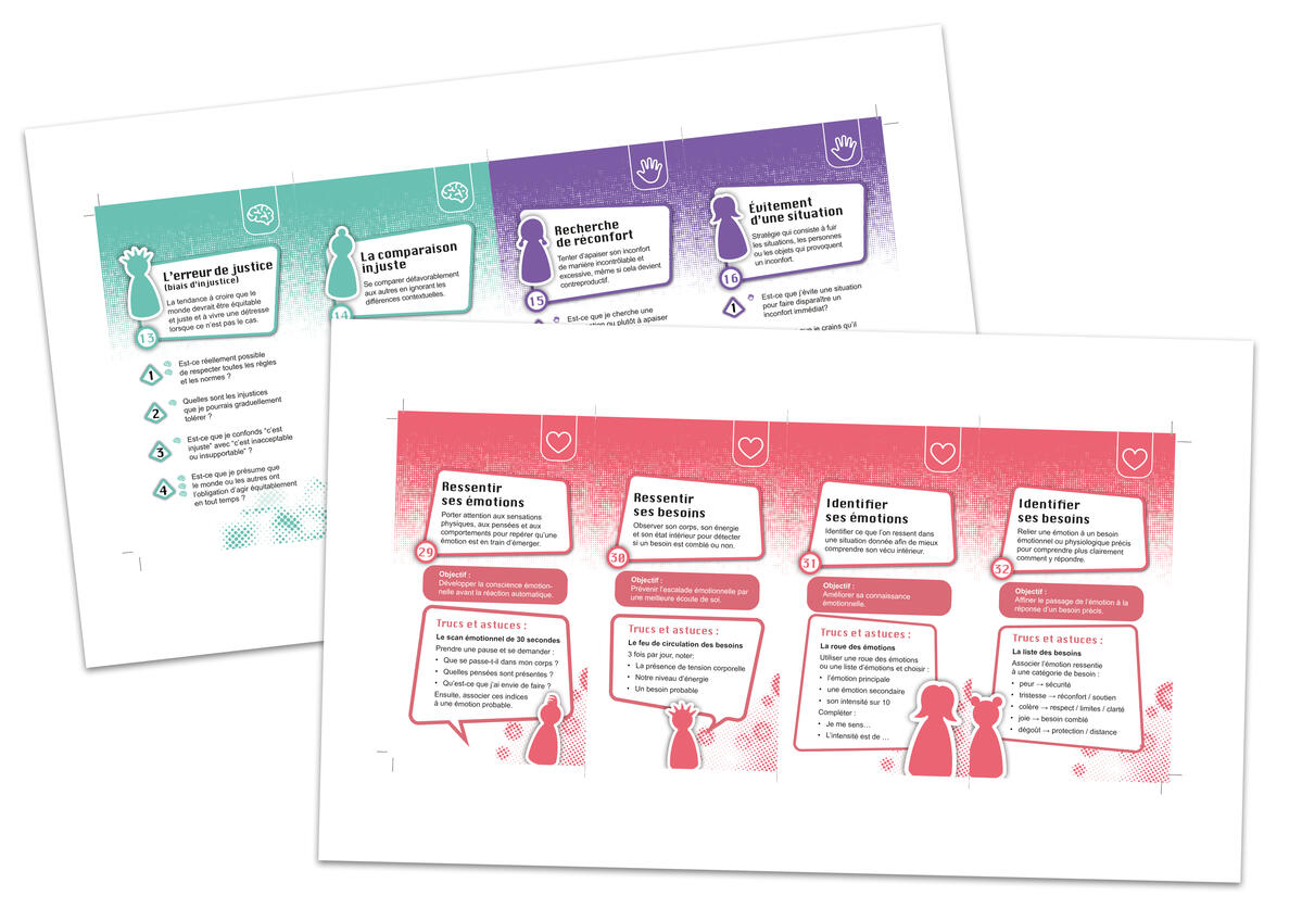 Le jeu repose sur un modèle central en thérapie cognitive comportementale (TCC): l’interaction entre les pensées, émotions et comportements permet de mieux reconnaître ses patterns et de mieux se comprendre.